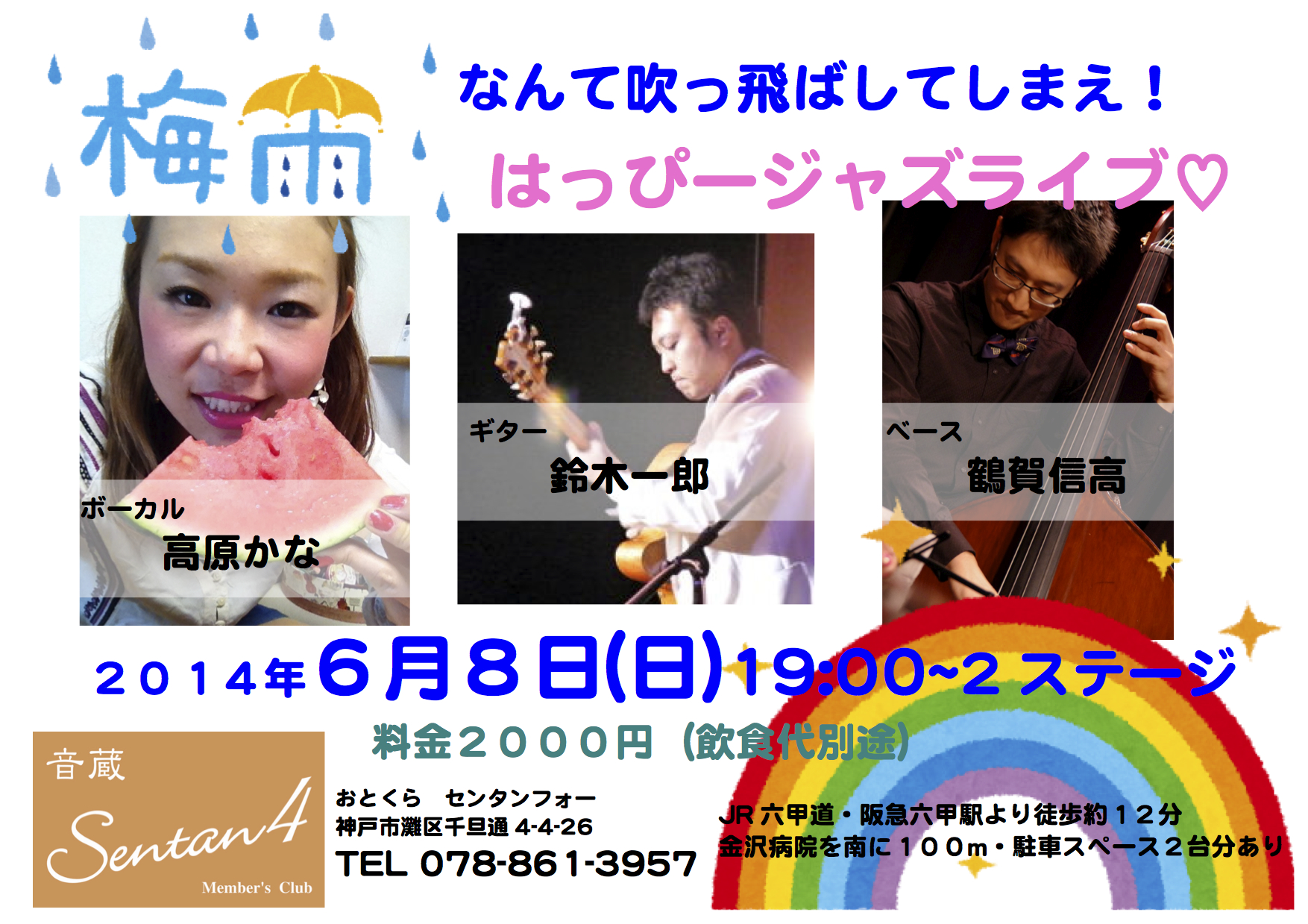 ☆6月8日(日曜日)神戸六甲・Sentan4(せんたんフォー)神戸市灘区千旦通4-4-26TEL078-861ー3957チャージ2000円 19時〜高原かな(ボーカル)鈴木一郎(ギター)鶴賀信高(ベース)