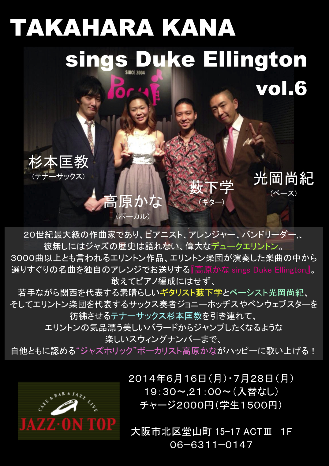 ☆7月28日(月曜日)東梅田・ジャズオントップアクトⅢ大阪市北区堂山町15−1706-6311-0147【高原かなsings Duke Ellington vol.7】19時30分〜、21時〜2回ステージ2000円(学生1500円)高原かな(ボーカル)杉本匡教(テナーサックス)藪下学(ギター)光岡尚紀(ベース)