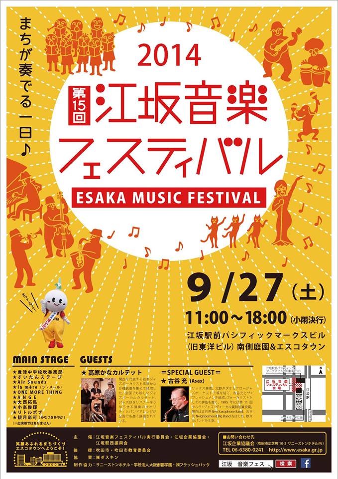 ☆9月27日(土曜日)大阪江坂・江坂音楽フェスティバル14時50分〜15時50分(予定)江坂駅前パシフィックマークスビル南側庭園&エスコタウン《高原かなカルテット》スペシャルゲスト 古谷充(アルトサックス)