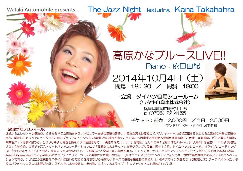 ☆10月4日(土曜日)兵庫県豊岡・ダイハツ但馬ショールーム(ワタキ自動車株式会社)兵庫県豊岡市寿町11-50796-22-4155前売2000円 当日2500円(ワンドリンク付き・小学生以下無料)《高原かなブルースLIVE!!》高原かな(ボーカル)依田由紀(ピアノ)